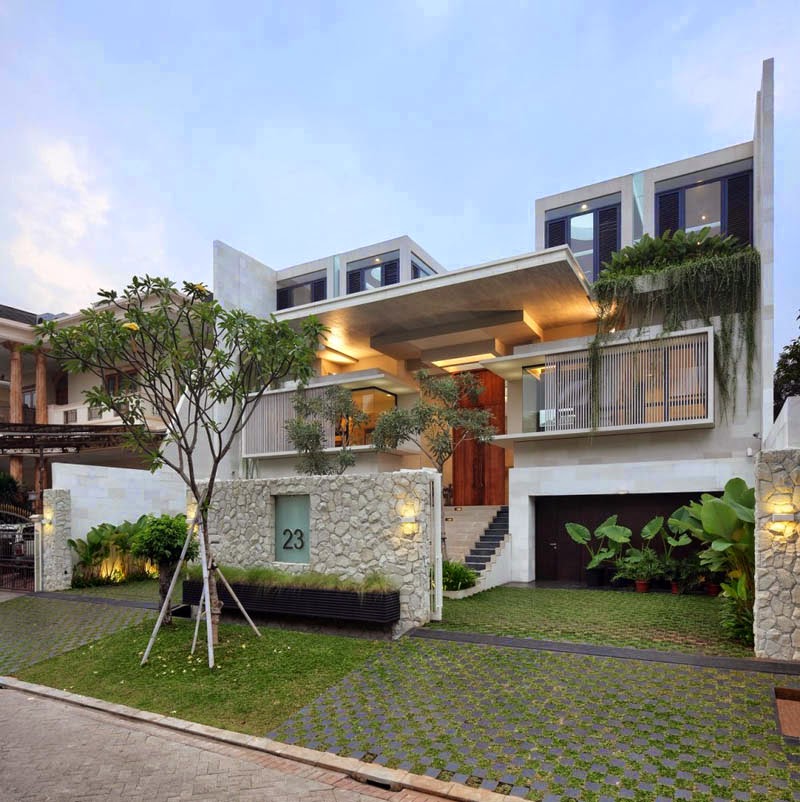 Give your front yard a sculptural look by mixing materials and colors boldly. A wooden bridge can be contrasted with stone on the concrete pathway. Also minimalist planters can keep a consistent look throughout.