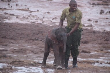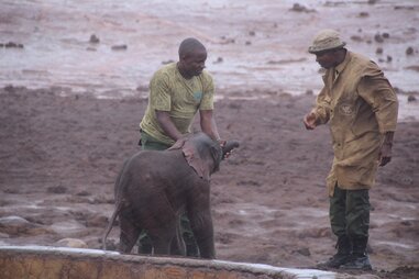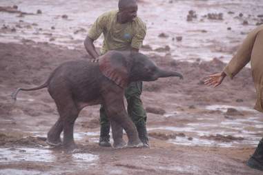 The baby had s.l.i.p.p.e.d into a drinking trough in Kenya’s Tsavo National Park, and the mud made it impossible for the newborn’s little legs to climb out.