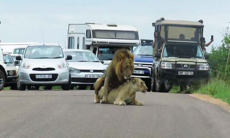 A female and male lion can be seen dossing in the middle of the street creating a build up in traffic. But the traffic gets even worse when the couple start a mating session in front of the cars